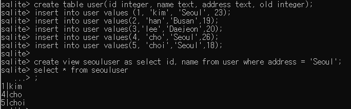 seouluser이라는 view를 만드는데 user테이블에서 주소가 Seoul인 사람의 id와 name만 가지고 있다.