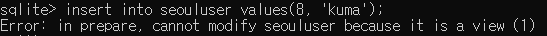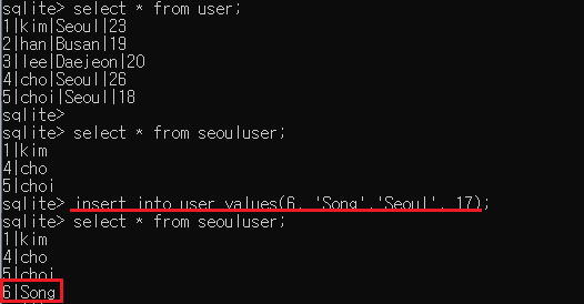 user 테이블에 Seoul에 사는 사람을 추가했더니, view로 된 seouluser에도 추가가 되었다.
