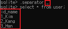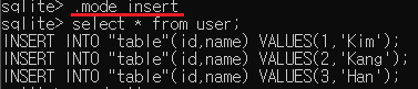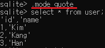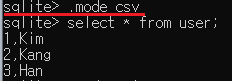 2) .mode 명령어 : select문의 실행 결과에 표시되는 데이터를 쉼표로 구분하여 표시할 것 인지, 아니면 탭으로 구분하여 표시할 것이지 등을 알 수 있습니다.