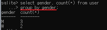 이번에는 group by절을 사용해보겠습니다. gender을 그룹화 하여 출력해 봅시다.
