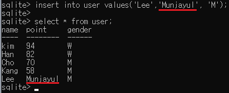 위에 사용한 user 테이블에 새로운 데이터를 추가해봅시다.