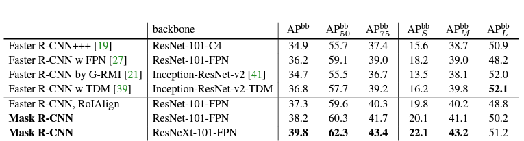ResNet-101-FPN백본을 사용한 Mask R-CNN의 성능이 더 뛰어 나다는것을 알 수 있습니다.