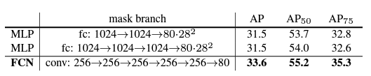 mask prediction에 MLP보다 FCN을 사용하는 것이 좋은 성능을 보입니다.