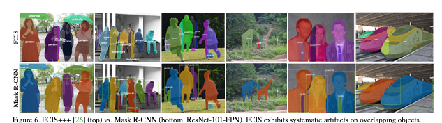 이번 그림에서는 FCIS+++과 Mask R-CNN 비교입니다. FCIS+++에서는 중복되는 instance에 대한 artifacts에 비해